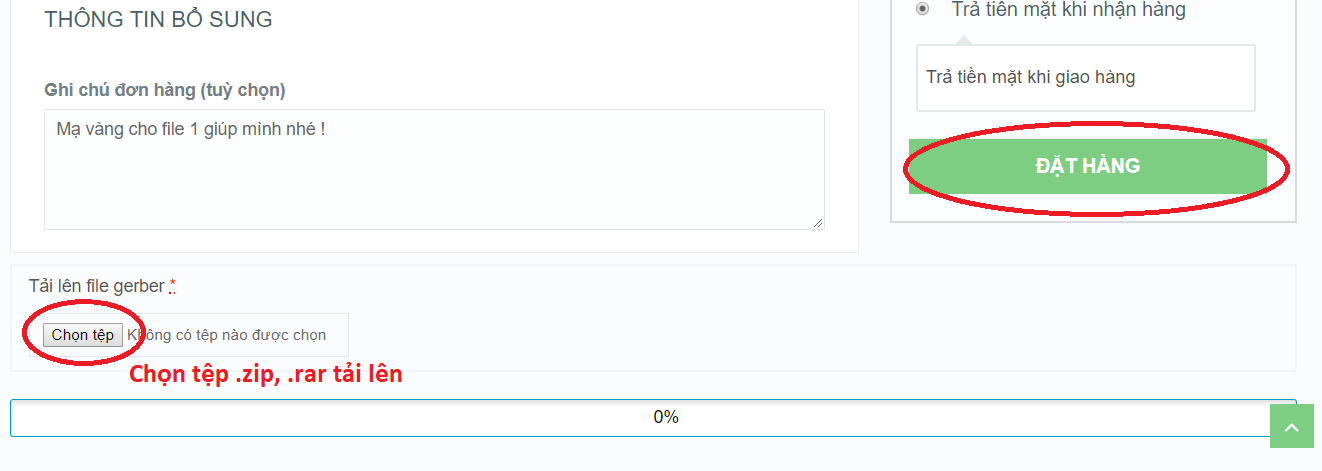 Cuối cùng update file gerber… Sau đó nhấn vào Đặt hàng. Để tiến hành gửi file gerber.
