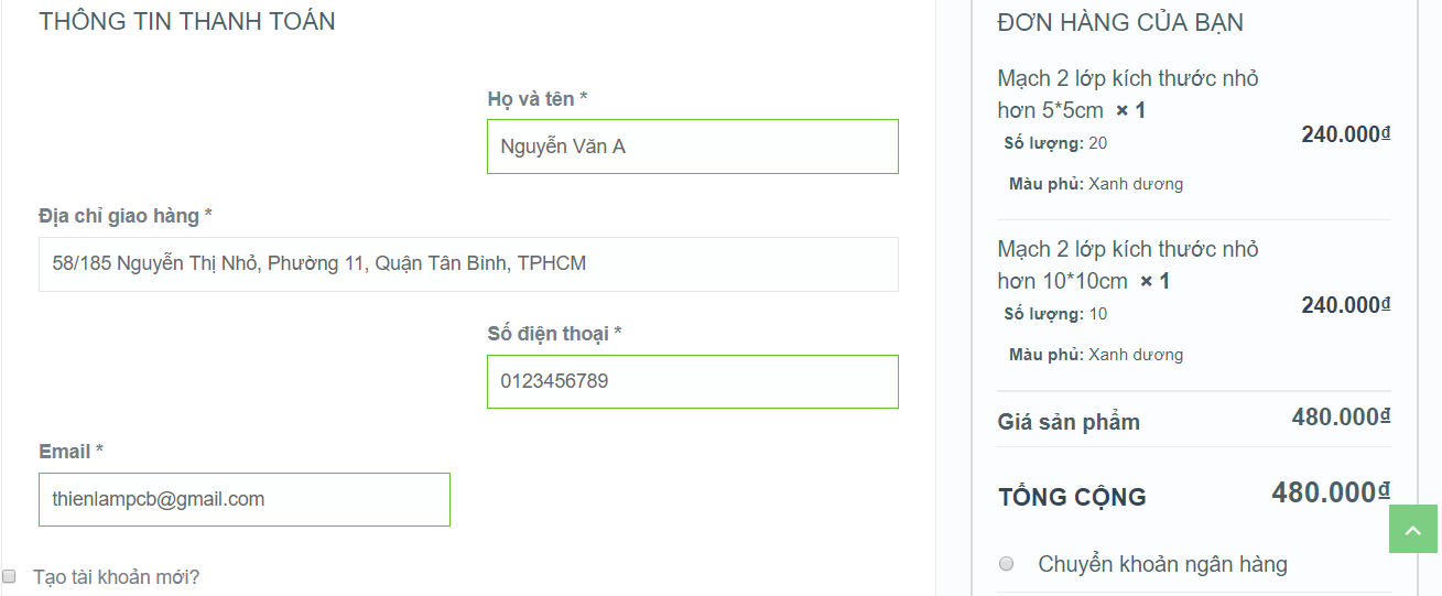 Sau khi thỏa thuận và đồng ý với bảng báo giá… Quý khách tiến hành chuyển khoản đến số tài khoản được ghi trong báo giá với nội dung: TLPCB [Mã đơn hàng]