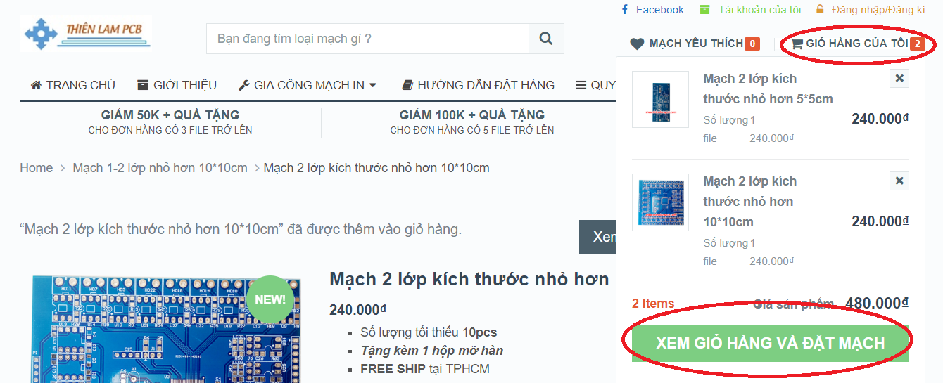 Sau khi Thêm mạch vào giỏ sẽ xuất hiện thông báo là mạch đã được thêm vào giỏ. Lúc này quý khách đã hoàn thành xong bước 2.