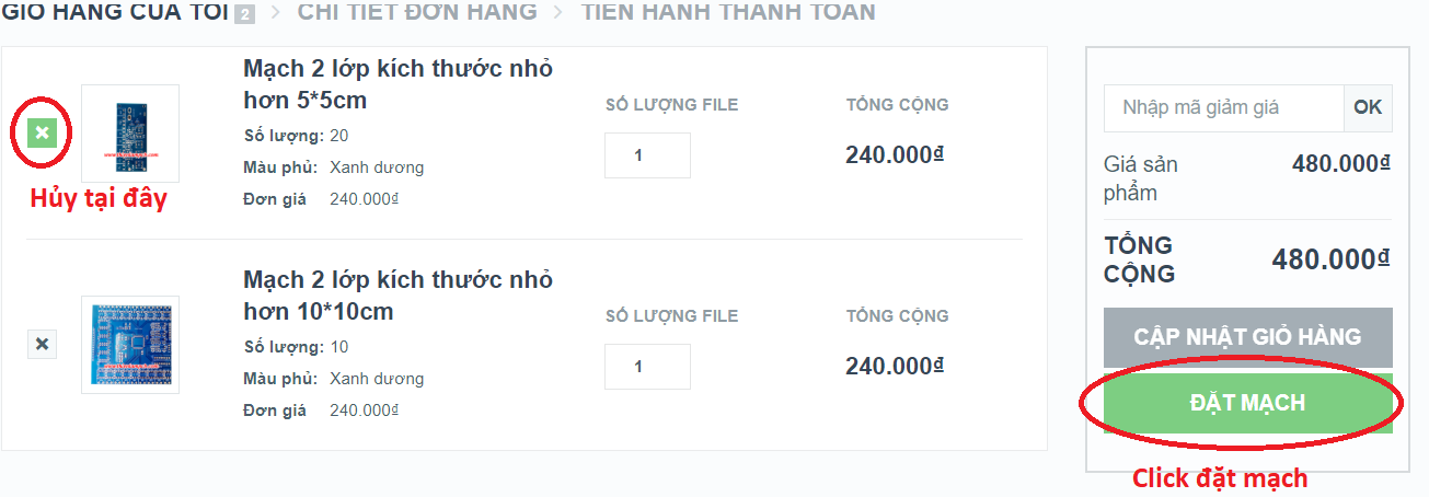 Bước 3: Sau khi đã thêm vào giỏ những loại mạch cần thiết. Ta tiến hành click vào Giỏ hàng của tôi kiểm tra những loại mạch mà ta đã thêm. Tại đây quý khách có thể thêm hoặc bỏ bớt những mạch mình đã chọn.